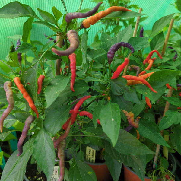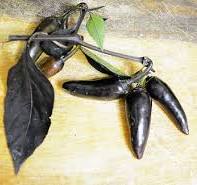 Az indiai PC-1 chili egy igazi szépség. A növények erőteljesek, viszonylag nagyra nőnek (kb. 1 méter), és gyönyörű lila színű leveleik vannak. Különböző hosszúkás paprikákat fejlesztenek, amelyek sötétlilától vagy majdnem feketétől pirosig érnek. A gyümölcsök nagyon intenzív fűszeresek. |